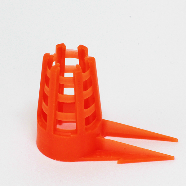 This cell protector was developed so we could install a cell in a nuc as it was moving down our nuc making assembly line. Naturally we wanted to keep the cell warm so this protector, with queen cell, was “pushed” into the brood between two frames.  The long prongs positively held the cell in the desired position on the comb.